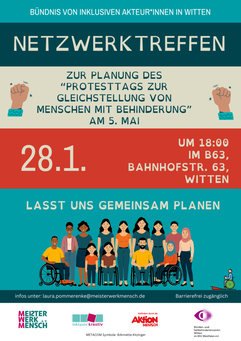 Wer: Das Netzwerktreffen richtet sich an alle Akteur*innen und Privatpersonen, denen Inklusion und Teilhabe am Herzen liegt und die sich mit uns für eine gleichberechigte Gesellschaft in Witten einsetzten möchten.